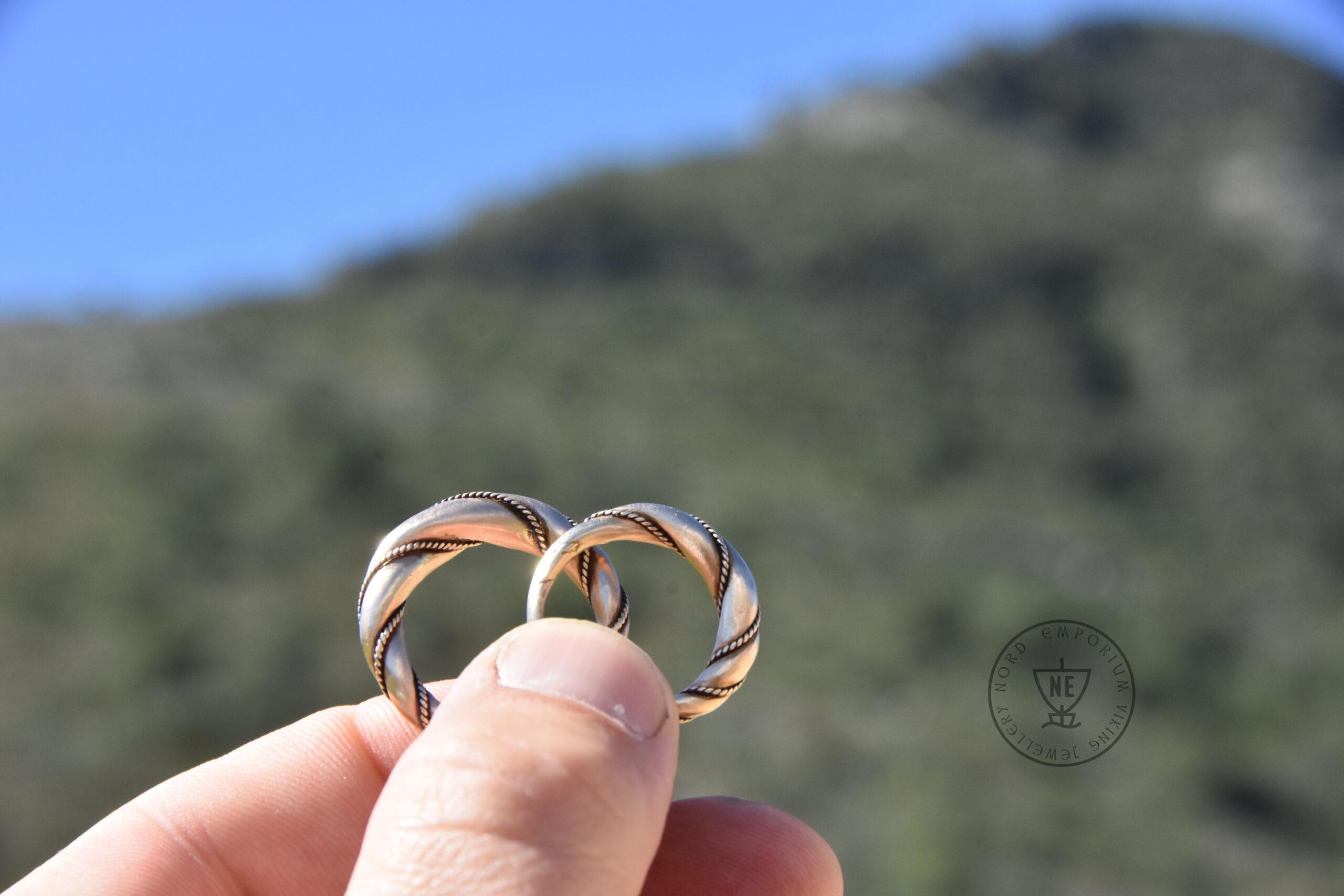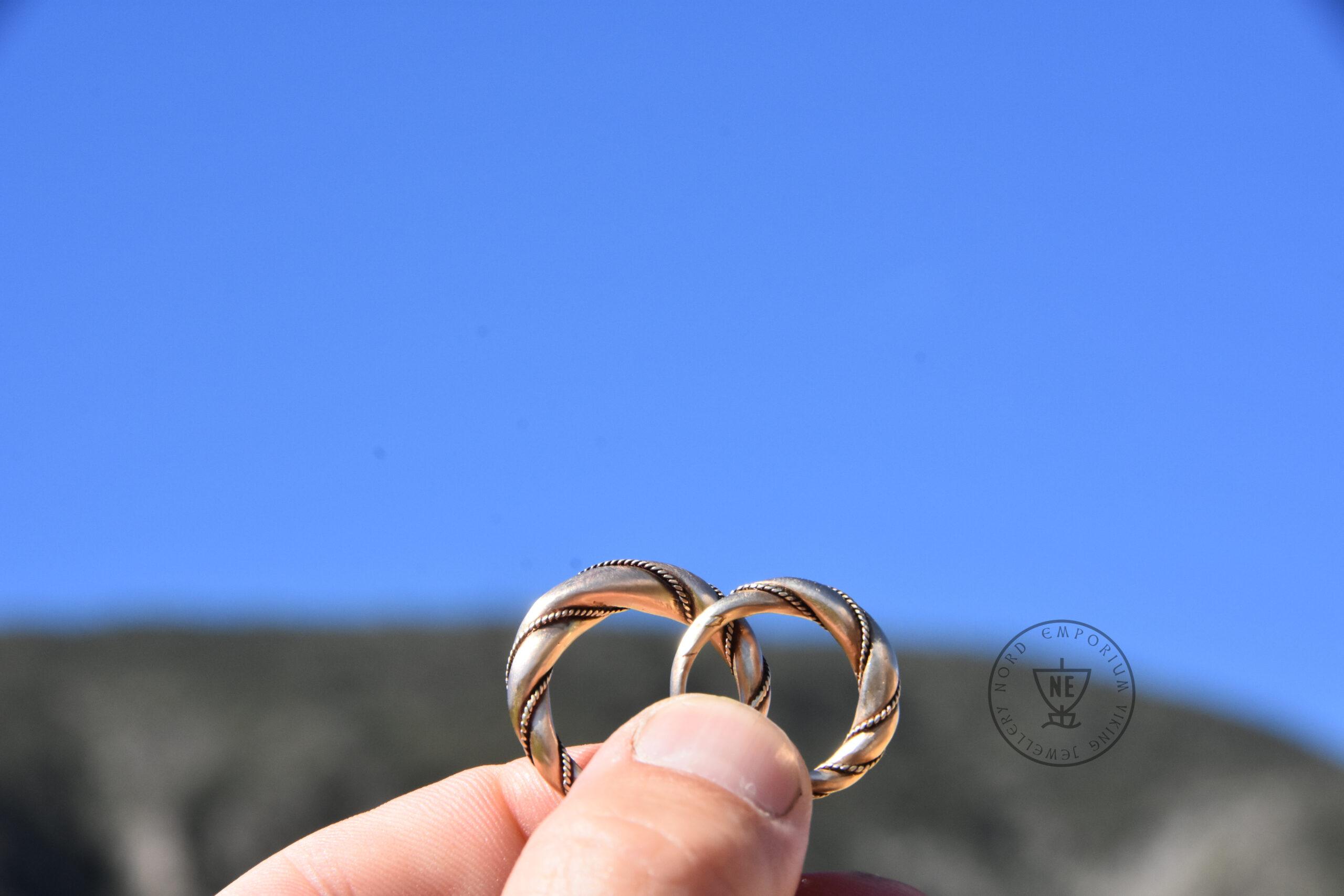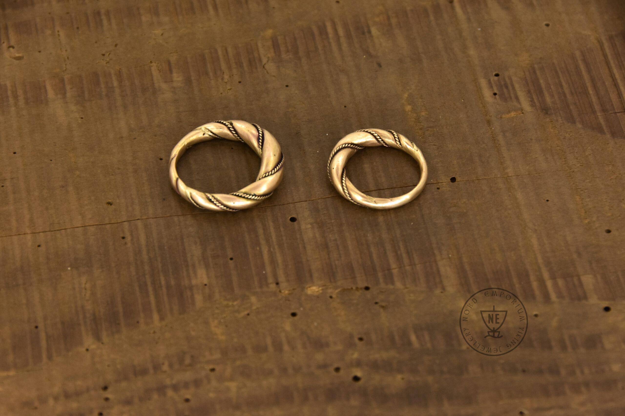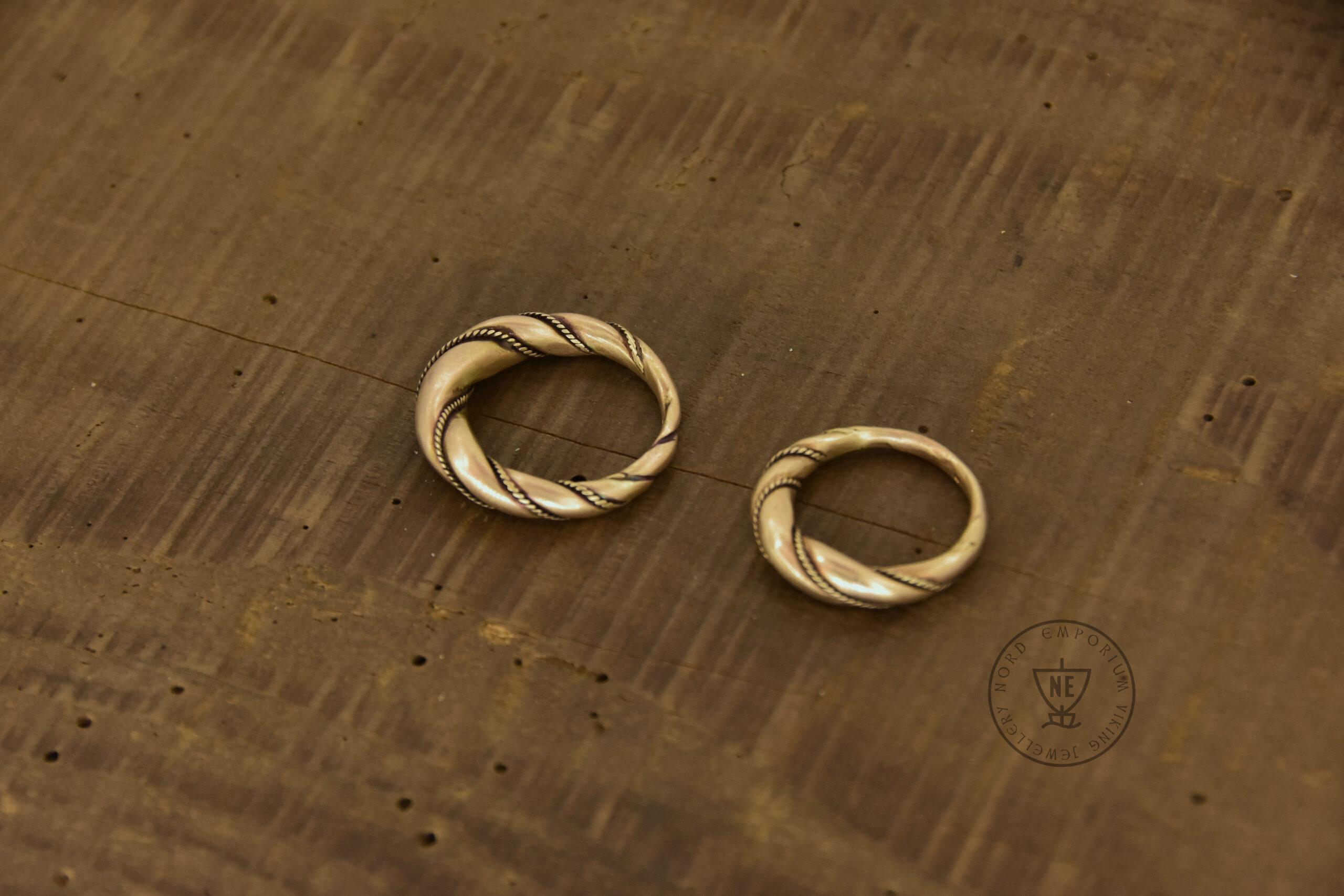The rings are decorated with thin twisted wires around them. Originally, it was simply beaded wire. The rings are matt-finished. The rings look like museum artefacts. If you wish to get your rings in a high-polished finish, let me know in the order form