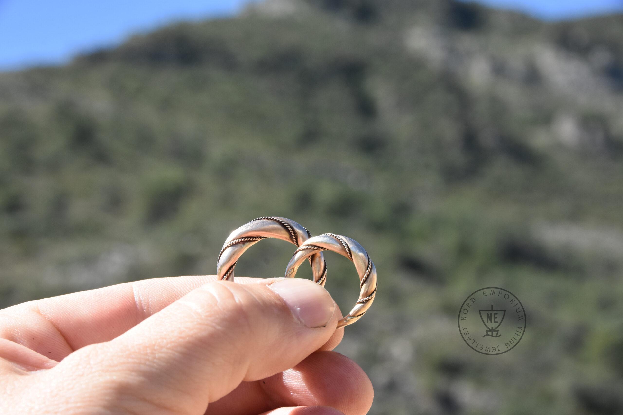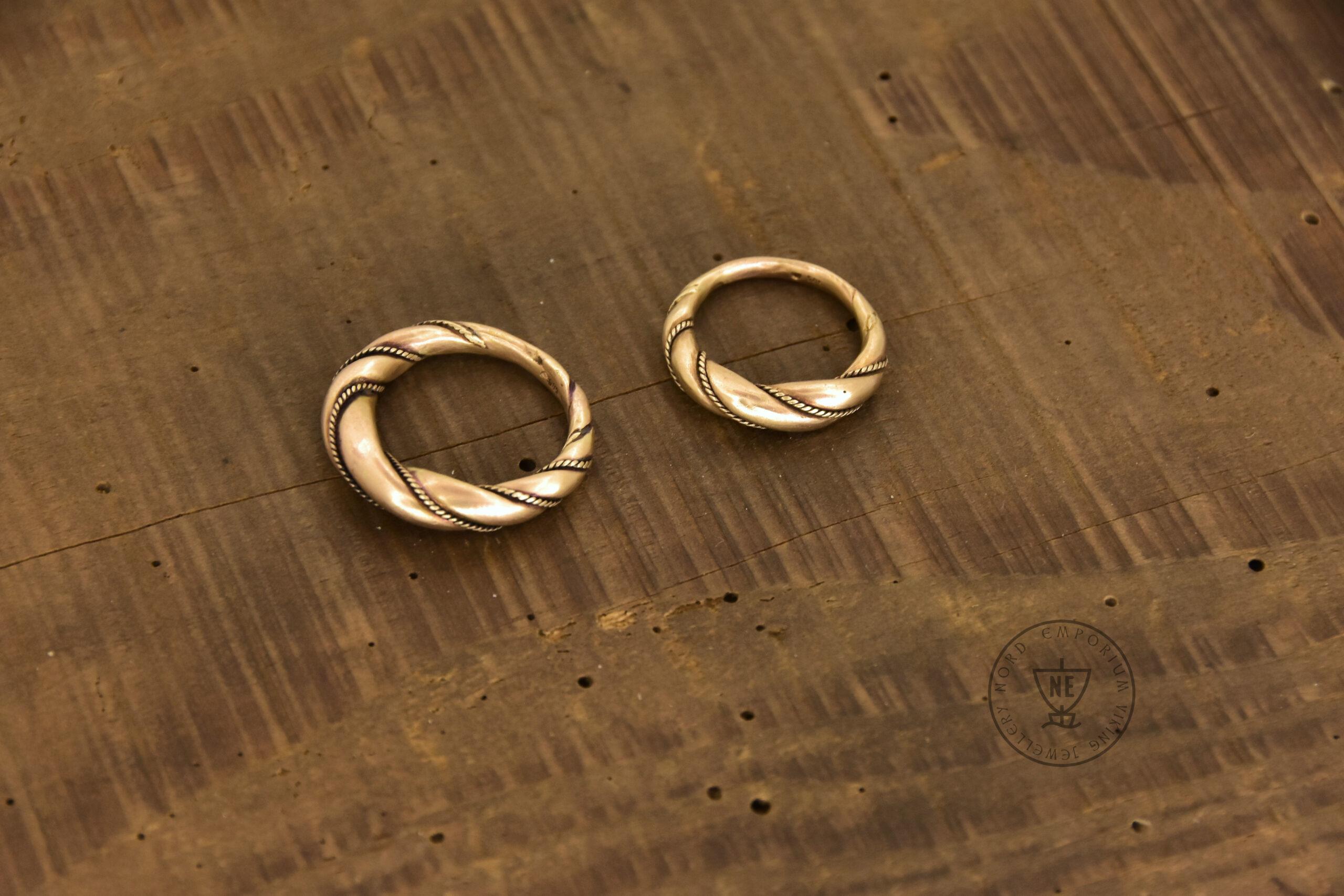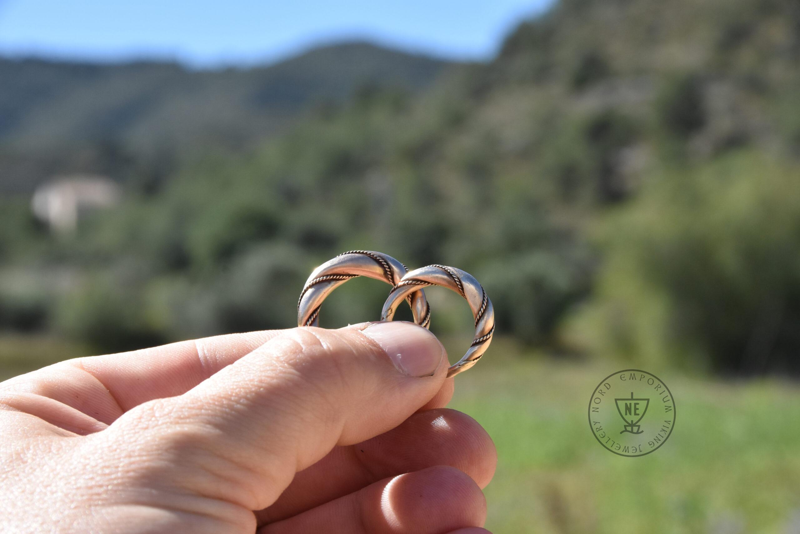 The rings are decorated with thin twisted wires around them. Originally, it was simply beaded wire. The rings are matt-finished. The rings look like museum artefacts. If you wish to get your rings in a high-polished finish, let me know in the order form