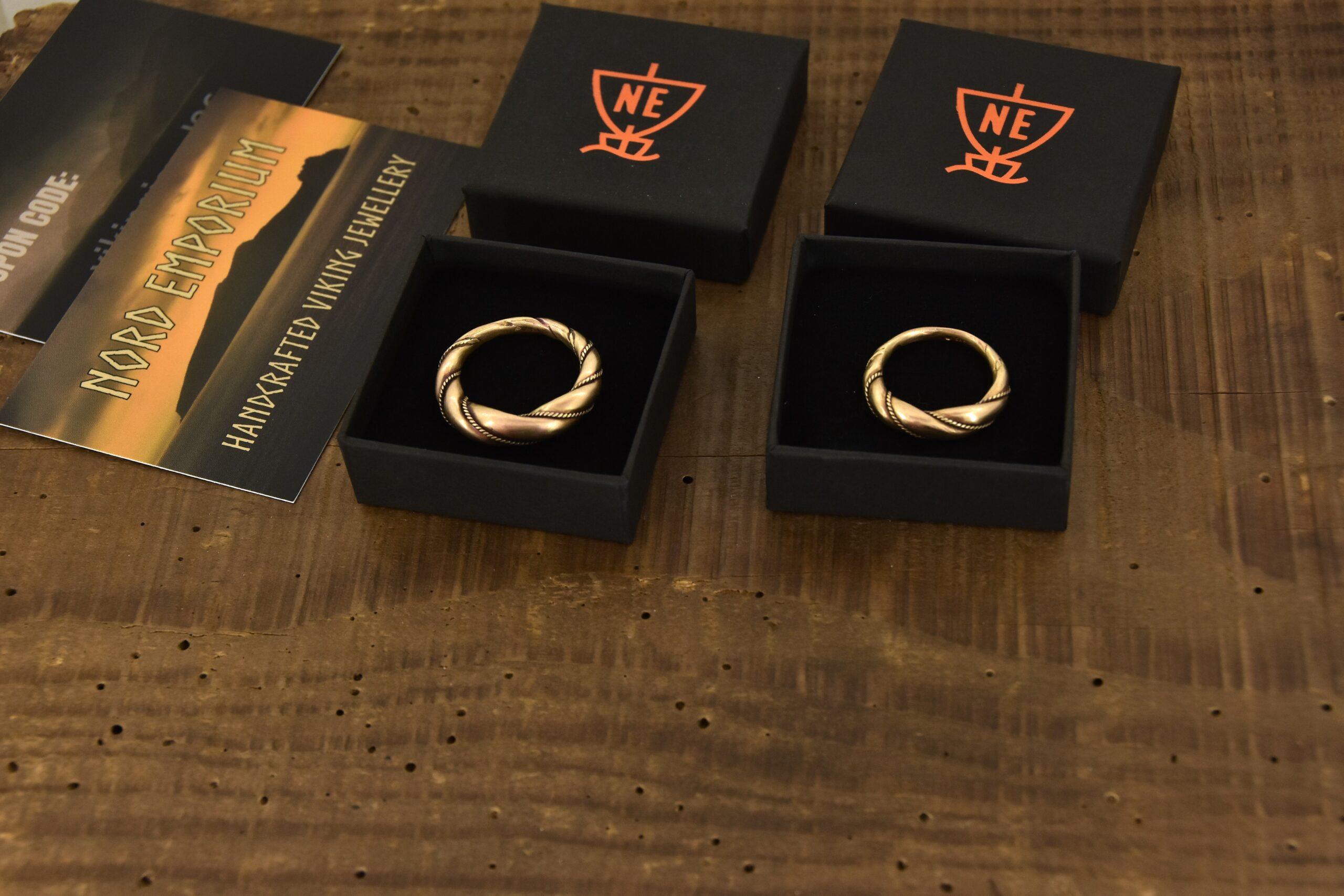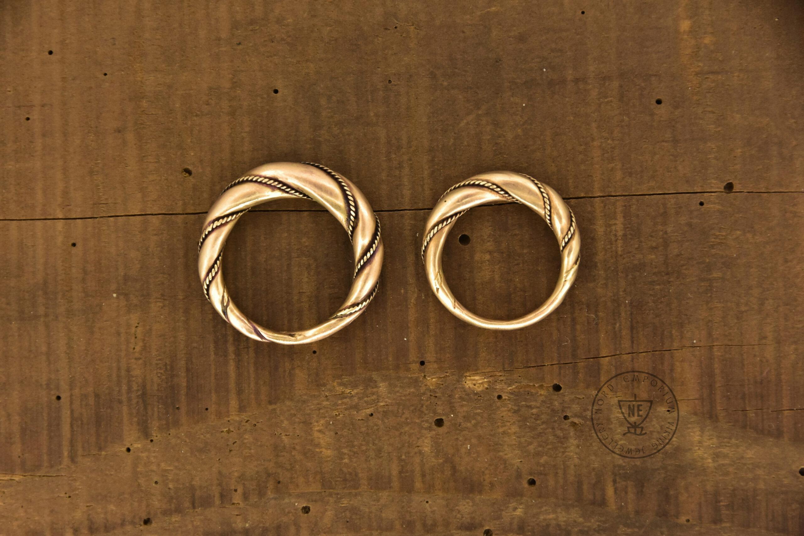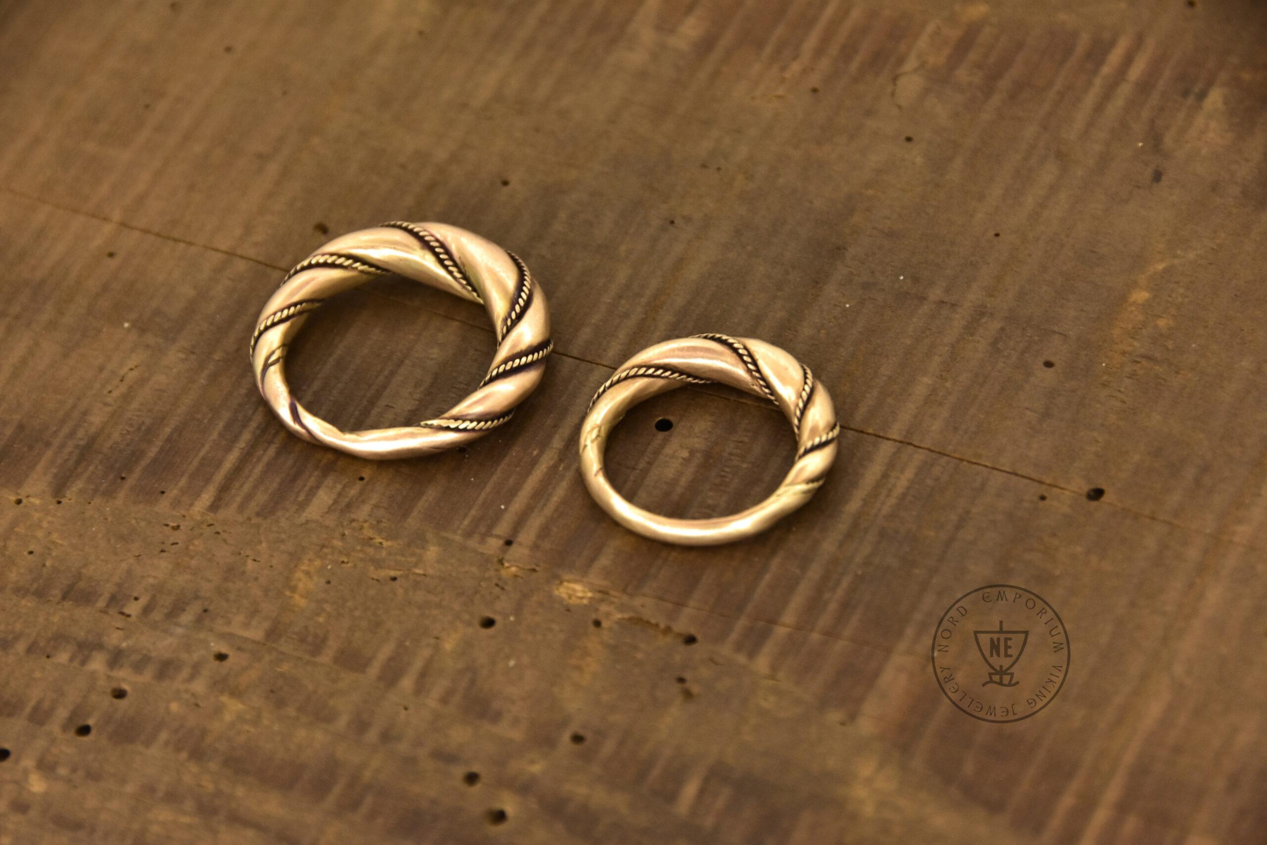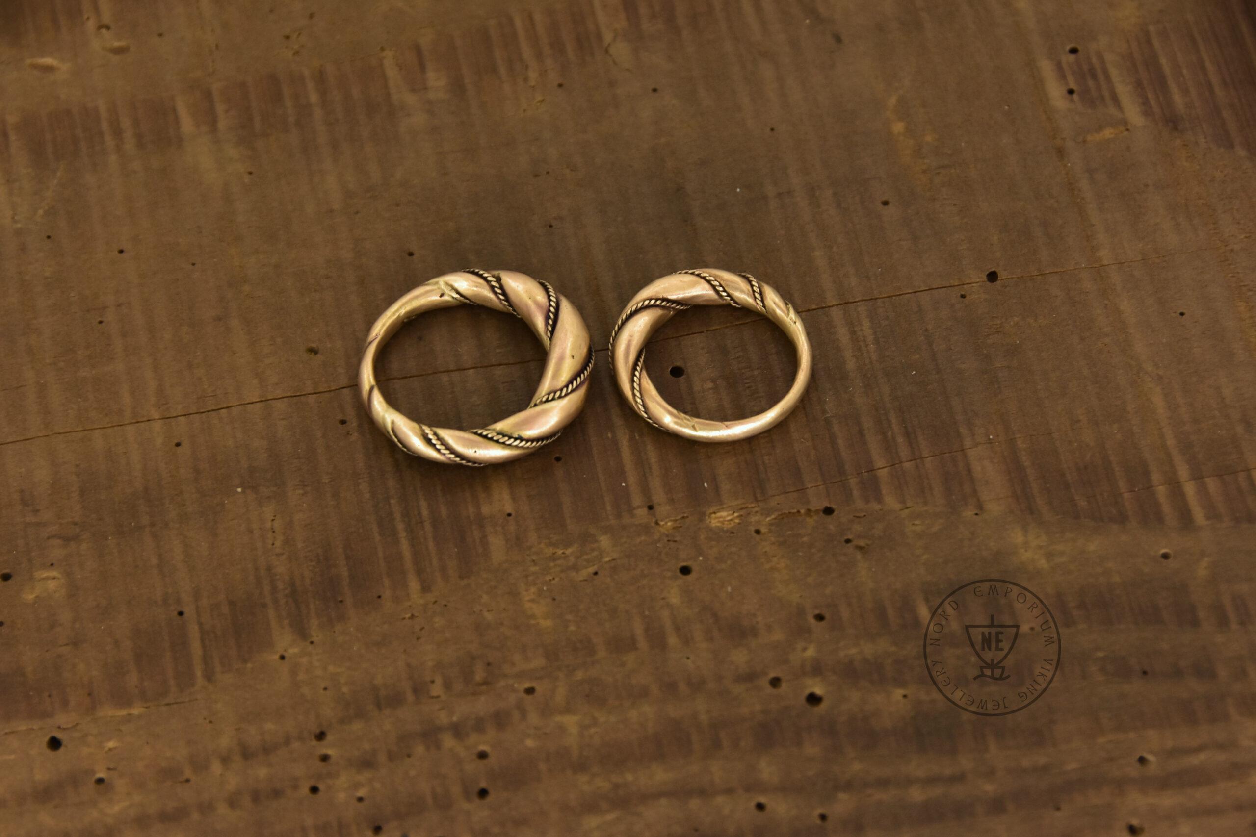 The rings are decorated with thin twisted wires around them. Originally, it was simply beaded wire. The rings are matt-finished. The rings look like museum artefacts. If you wish to get your rings in a high-polished finish, let me know in the order form