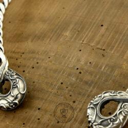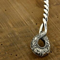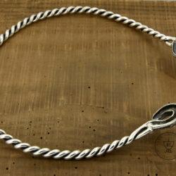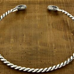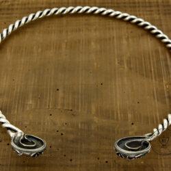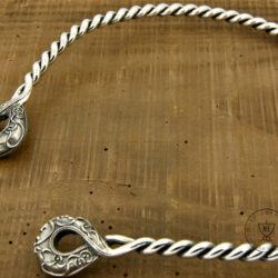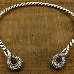 Celtic Torc, based on the finding from Ipswich, Suffolk, England. Made of Sterling Silver. The terminals were cast onto the neck-ring using the lost wax method. Original was made of Gold alloy and is held in British Museum